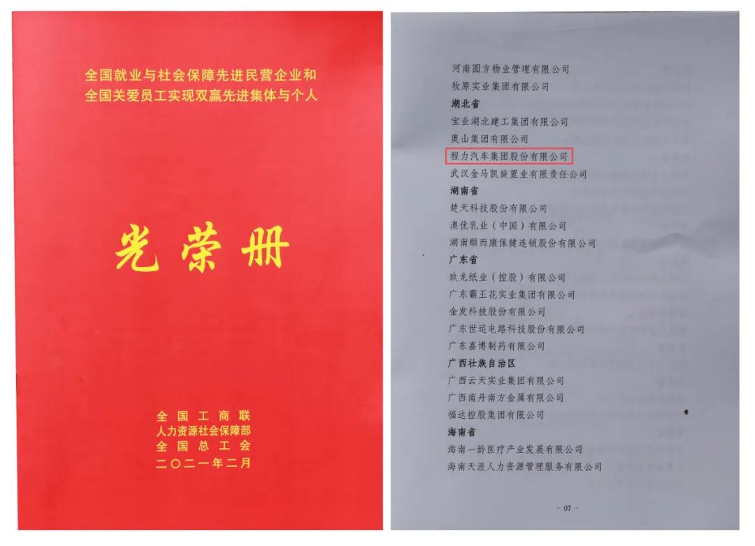 3月2日,程力汽車集團股份有限公司收到國家人力資源和社會保障部、中華全國工商業(yè)聯(lián)合會、中華全國總工會聯(lián)合頒發(fā)的“全國就業(yè)與社會保障先進民營企業(yè)”榮譽證書及牌匾,這是程力汽車集團股份有限公司在2021年初被授予的開門紅全國性殊榮,也是程力集團繼2020年連續(xù)三次受到全國性榮譽表彰。